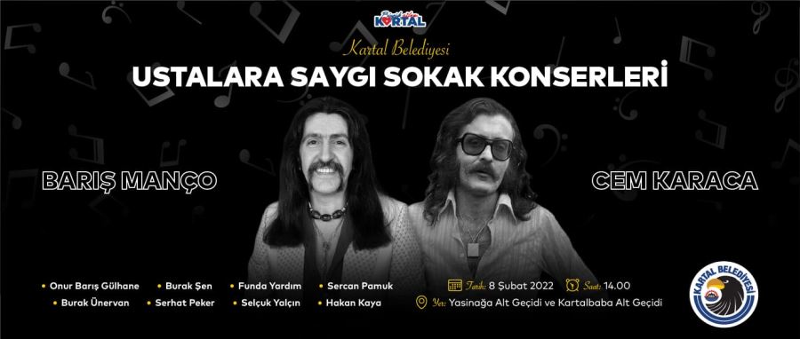 Kartal Belediyesi, Anadolu rock müziğinin unutulmaz sanatçıları Barış Manço ve Cem Karaca anısına 8 Şubat Salı günü “Ustalara Saygı Sokak Konserleri” düzenliyor.
