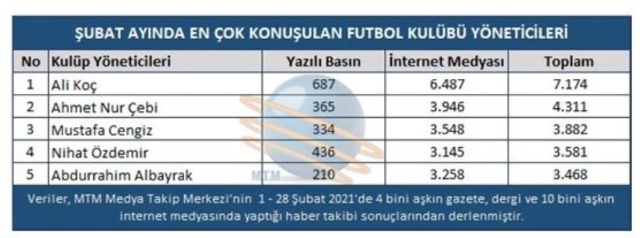 Geride bıraktığımız Şubat ayında toplam 7 bin 174 habere konu olan Fenerbahçe Başkanı Ali Koç en fazla konuşulan yönetici sıralamasında birinci sırada yer alırken, Ahmet Nur Çebi ise 4 bin 311 haber ile ikinci, Mustafa Cengiz ise 3 bin 882 haberle üçüncü sıraya adını yazdırdı.