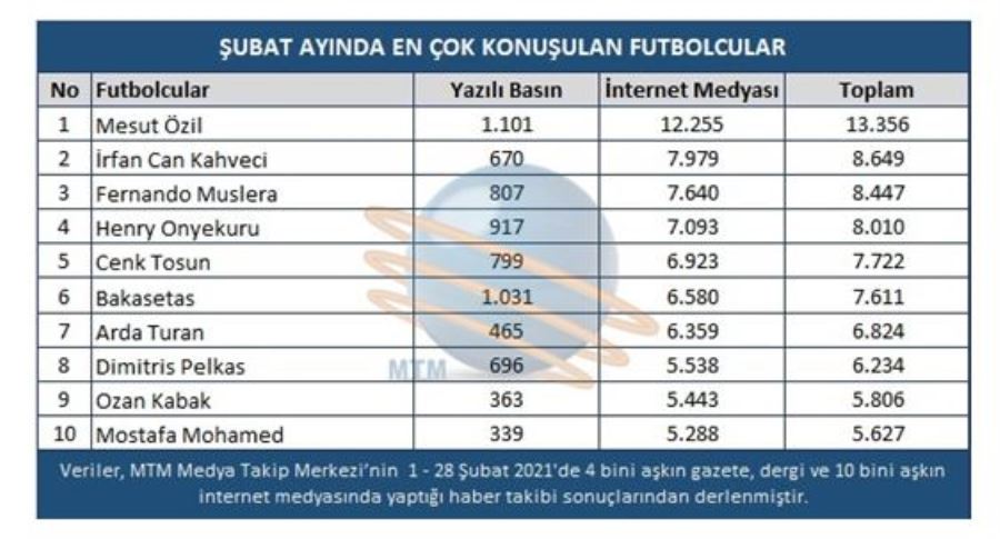 Ocak ayının ardından Şubat ayında da en fazla konuşulan futbolcu olan Mesut Özil, Türk medyasında 13 bin 356 habere adını yazdırarak listenin ilk sırasında yer aldı. İkinci basamakta ise Fenerbahçe’nin orta saha oyuncusu İrfan Can Kahveci 8 bin 649 haber ile yer alırken, listenin üçüncü sırasında ise 8 bin 447 haber ile Galatasaray’ın kalecisi Muslera yer aldı.