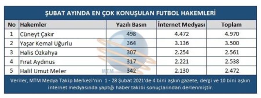 FIFA kokartlı hakem Cüneyt Çakır, Portekiz'in Benfica ile İngiltere'nin Arsenal takımları arasında 18 Şubat Perşembe günü oynanan UEFA Avrupa Ligi Son 32 Turu maçını yönetti. Cüneyt Çakır’ın Benfica-Arsenal maçındaki yönetimi ülkenin günlük spor gazetesi Record ve hakem yorumcusu Pedro Henriques tarafından göklere çıkarıldı. Tecrübeli hakemin performansını değerlendiren Portekiz basını Çakır’ın kusursuz bir maç yönettiğini belirtti. Türkiye’yi her defasında başarıyla temsil eden Çakır, 4 bin 970 haber ile Şubat ayında da en çok konuşulan hakem oldu. Listenin ikinci sırasında 3 bin 500 haber ile Yaşar Kemal Uğurlu, üçüncü sırasında ise 2 bin 561 habere adını yazdıran Halis Özkahya yer aldı.