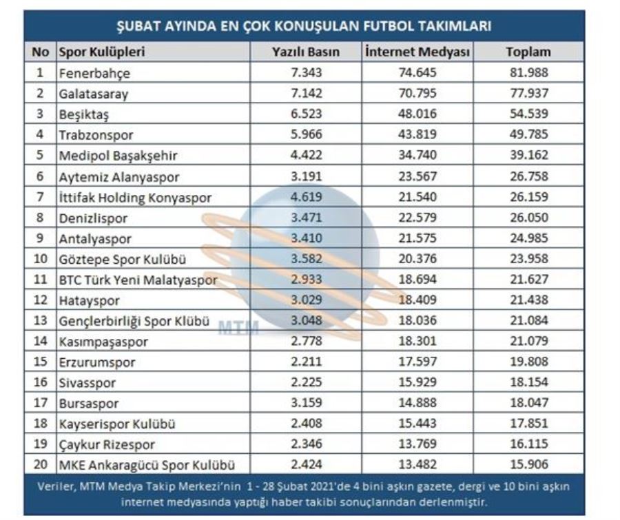 Spor basınında toplam 81 bin 988 haberde yer alan Fenerbahçe, saha sonuçlarını alamasa da en fazla konuşulan takım olma unvanını sürdürmüş oldu. Listenin ikinci sırasında 77 bin 937 haber ile Galatasaray yer alırken, üçüncü sırasında ise 54 bin 539 habere konu olan Beşiktaş yer aldı.