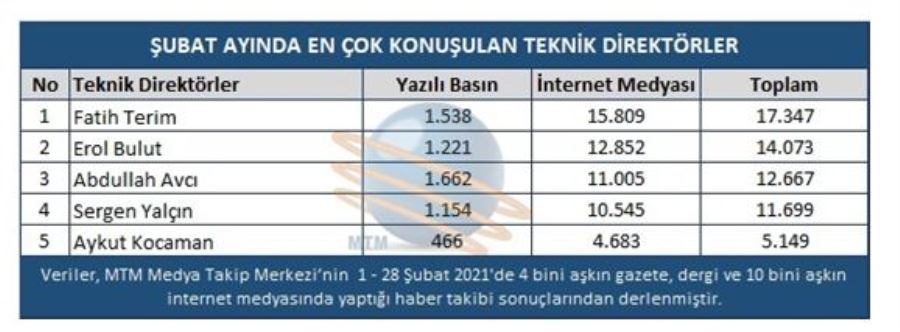 Daha önce pek çok kez “en çok konuşulan antrenör” olma unvanını kimseye kaptırmayan Fatih Terim, ay boyunca toplam 17 bin 347 haberde yer alarak Şubat ayının da lideri oldu. Terim’i ikinci sırada 14 bin 73 haber ile Erol Bulut, üçüncü sırada ise 12 bin 667 haber ile Trabzonspor’u şampiyonluk potasına sokan Abdullah Avcı izledi.