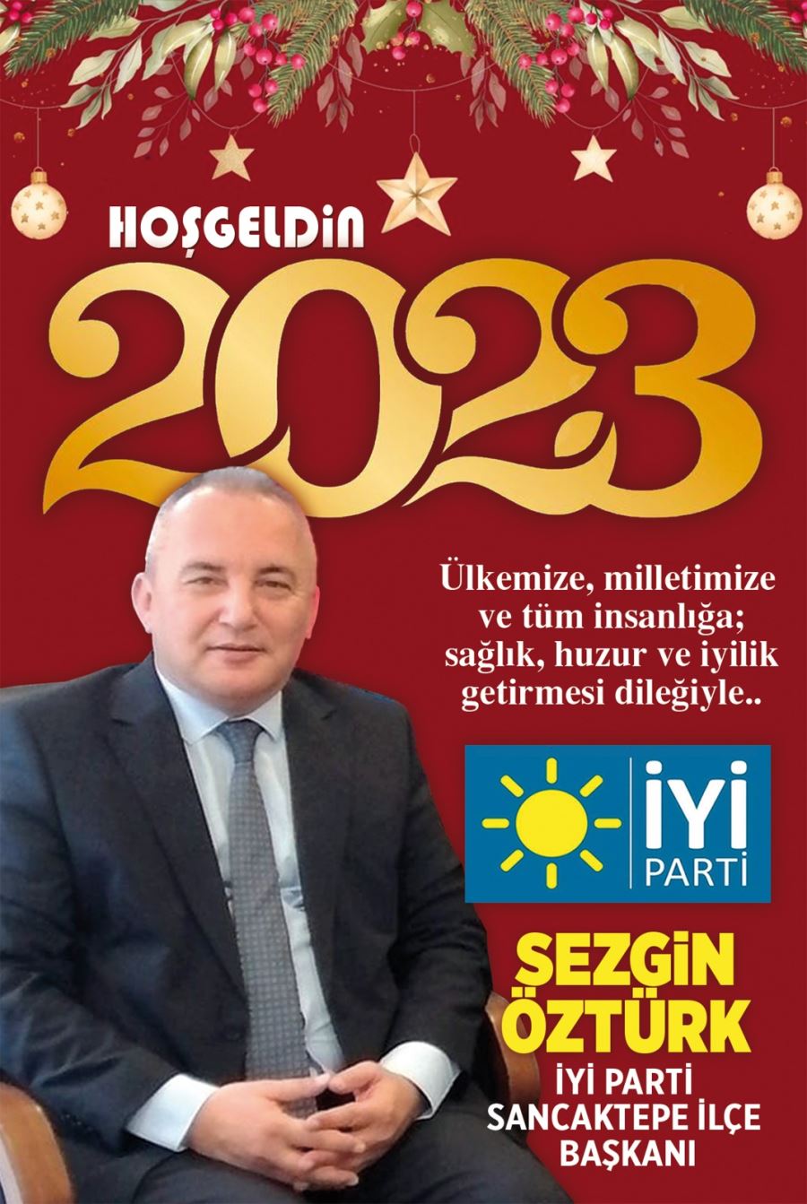 İYİ Parti Sancaktepe İlçe Başkanı Sezgin Öztürk yeni yıl mesajında “ 2022 yılına güle güle derken, 2023 yılına hoş geldin diyoruz. Yeni yılda tüm iyiliklerin sizleri kucaklaması temennisi ile , yeni yılın tüm insanlığa barış, huzur, sağlık, mutluluk ve iyiliklerle dolu günler getirmesini diler, yeni yılınızı kutlarım.” Dedi.