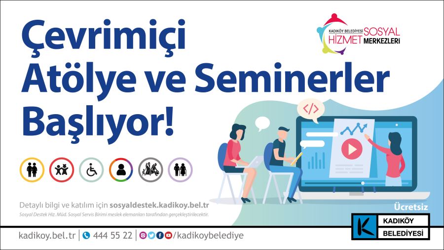 Kadıköy Belediyesi Sosyal Destek Hizmetleri Müdürlüğü'nün farklı gruplara yönelik hazırladığı atölye ve seminerler psikolog, sosyolog, sosyal hizmet uzmanı, özel eğitim öğretmeni, çocuk gelişim uzmanı ve gelişim psikologu, rehber ve psikolojik danışmanlar tarafından düzenleniyor. Çevrim içi düzenlenecek programlara http://sosyaldestek.kadikoy.bel.tr/etkinlikler adresinden kayıt yaptırarak ücretsiz katılmak mümkün.