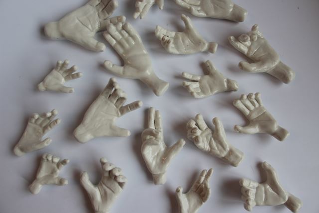 “Genel olarak ben sağlıkçıların tükenmişliğini nasıl gördüğümü porselen çamuru ile ifade ettim. Porselen pişmeden önce yumuşak, kuruduğunda kırılgan ama kolay yapışan ve fırına girip piştiğinde ise 1250 derece gibi çok yüksek ısıya dayanan bir malzeme. Tıpkı sağlıkçılar gibi. Bana ilk ilham veren Covid nöbetinden çıkan bir sağlıkçının eldivenini çıkardığında buruş buruş ellerinin fotoğrafıydı. Ben bu eli yaptım ilk. Sonra birbirlerinin üstüne yığılmış ve adeta nöbet çıkışı kirliye atılan formalar gibi birbirinin üstüne yığılmış kağıt gibi sağlıkçılar yaptım. Maskeler ve siperliklerin yüzde yaptığı yaraları olan masklar yaptım. Tüm bunlar hep tükenmişliklerin görülmesi ve hatırlanması içindi. Ancak sağlıkçıların ellerinin herşeye rağmen şifa vermeye açık olduğunu hatırlatmak için bir çok beyaz porselen minik el yaptım. Bunlar ayrıca bizim de hem sağlıkçılara hem de tüm topluma uzatmak istediğimiz ellerimiz. Yani dayanışmanın elleri.”