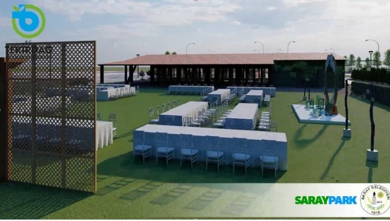 Saray Kent Park ve Sosyal Tesis projesinde 800 m²’lik sosyal tesis planlanmış olup 550 m²’si Kapalı Düğün Salonu olmak üzere mutfak, wc’ler, gelin odası ve büfe de yer almaktadır. 48 araçlık otoparkın yanı sıra düğün salonunun ön tarafında da 1.200 m²’lik açık kır bahçesi de yapılacak.